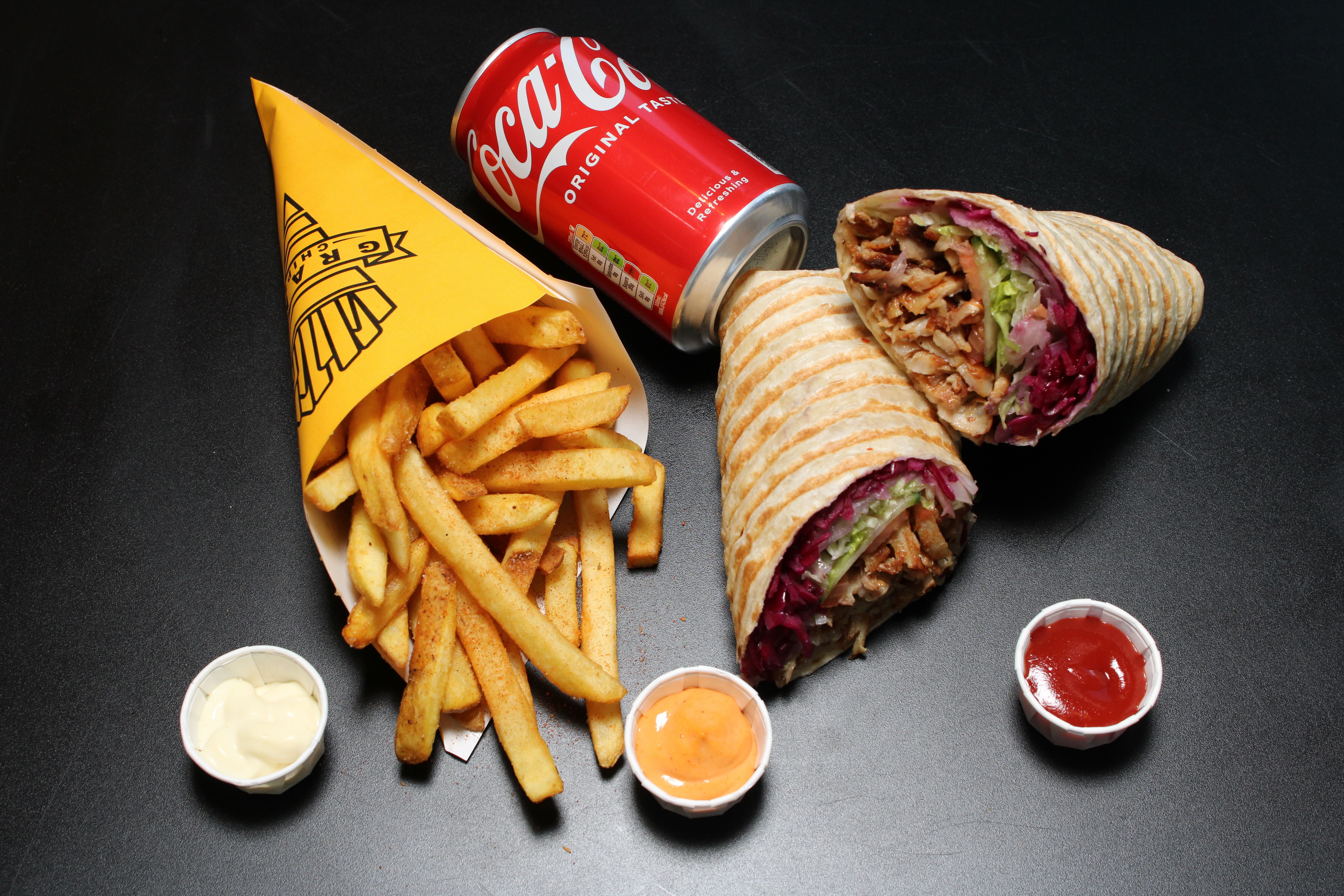 German Doner & Grand Chips offers authentic halal chicken and beef doner, along with vegetarian (halloumi) and vegan (falafel) options. These can be enjoyed as wraps or in boxes with chips and/or salad.